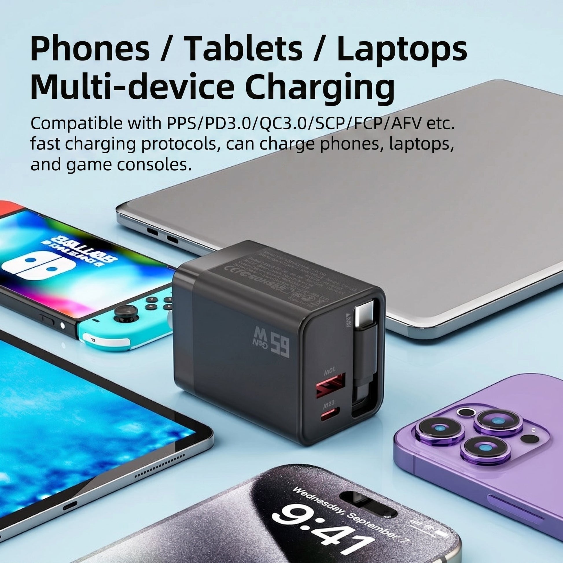 This 3-in-1 charger with a retractable function is the ultimate portable solution. It combines 65 W of fast charging power and three versatile ports in one compact, travel-friendly wall plug. It offers maximum convenience and safety for all your electronic devices, enabling effortless and clutter-free charging on the go.